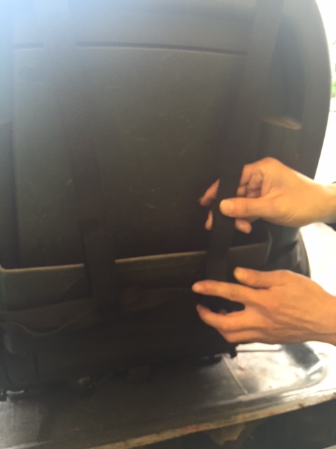 | さらに肩側の紐も、椅子の後ろに持っていきます。 |