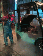 工場でまず洗車をします。エンジンフードを開け、エンジンルームまで全てきれいにします。