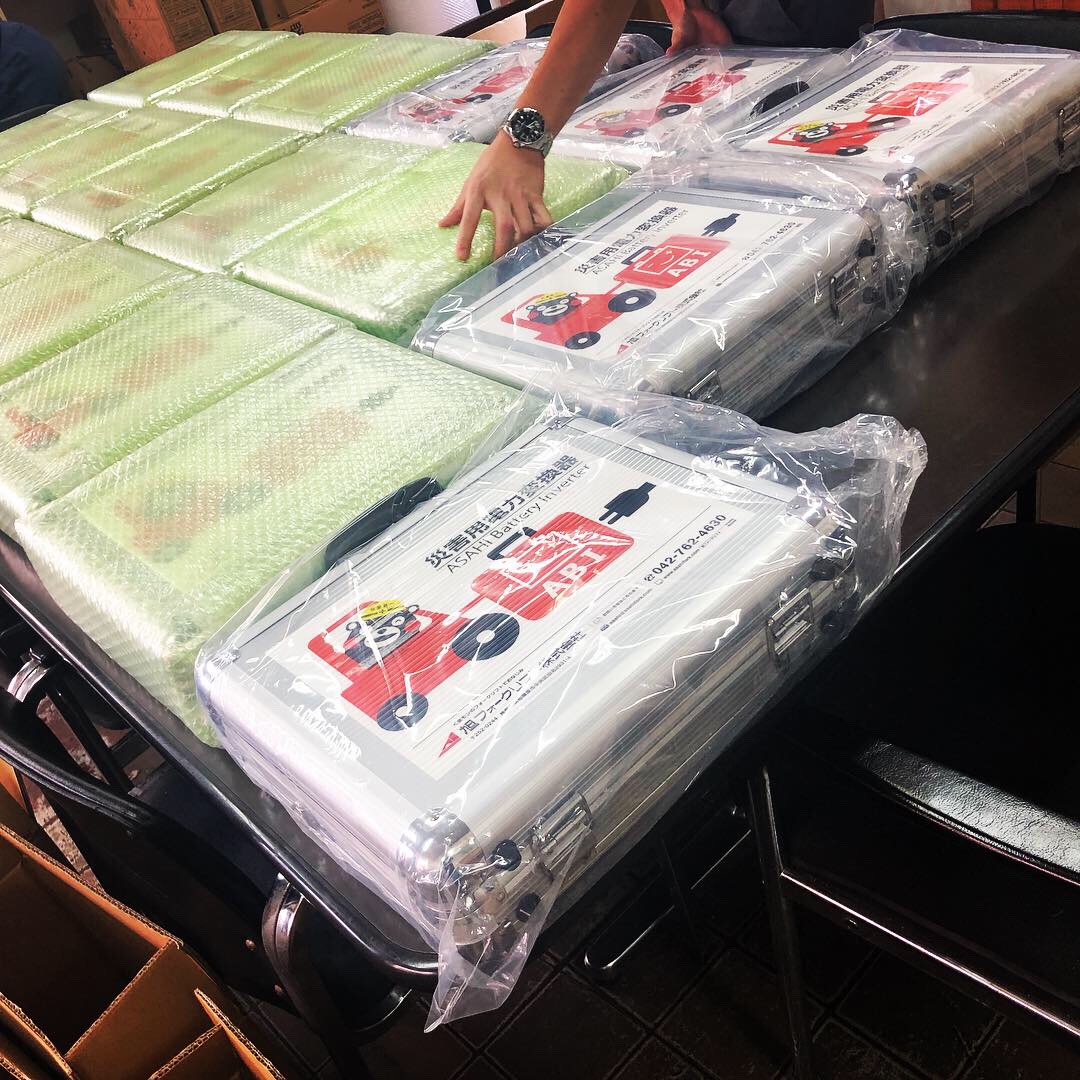 こちらの「災害用 電力変換機(ABI)」は、フォークリフトが積んでいる直流48ボルトのバッテリーから電源を取って、一般家電製品(100ボルトの電気)が使用できるようになる装置です。