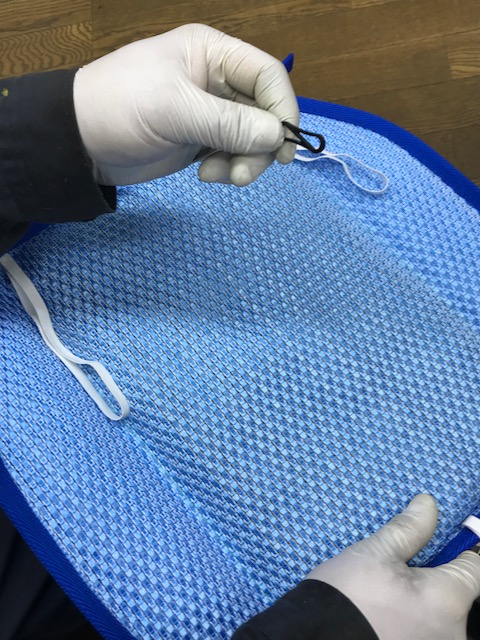 4、最後に、背もたれの裏側に青い紐を通して結びます。
